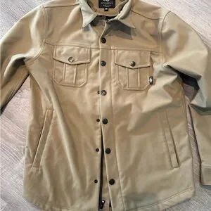 Mens Saga Softshell Jacket Size Medium (fits like a large). Full Zipper with snaps. Light insulation and DWR. This was originally a Ski Jacket with zip off hood ( not sold with hood). It is a Softshell Material so very durable.