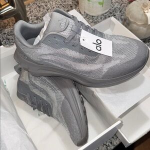 Stylish ALO Yoga sneakers. Sleek gray design. Comfortable fit.
