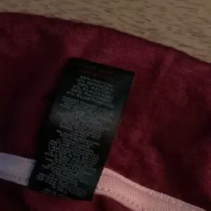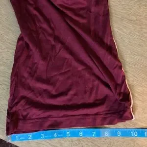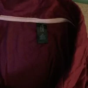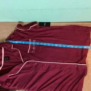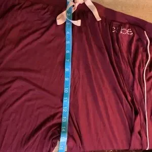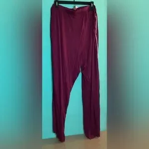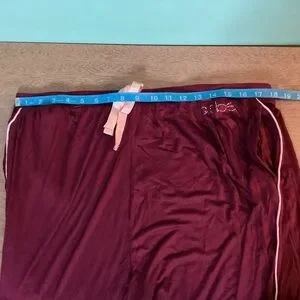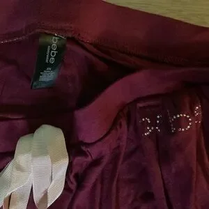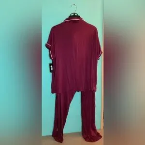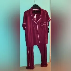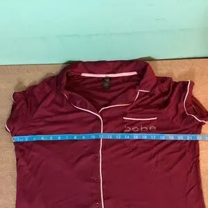 These are a new with tags set of Bebe short sleeve pajamas in a size 2X. The set includes a short sleeve top with a front pocket and pajama pants with pockets and a drawstring. The colors are maroon with pink accents. They are made of 95% rayon and 5% spandex. There is a manufacturing flaw on the gems on the bottoms with the b not being perfect.