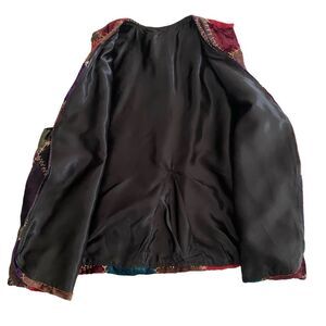 Features a vibrant array of different color velvet patches stitched together with fun detail. Interior is a black color (more than likely rayon). Condition is consistent with vintage age including minimal normal wear. Approximate measurements lying flat: PTP: 21” L: 23” Please message prior to a bundle purchase. #velvet #patchwork #90s #boho #luxe