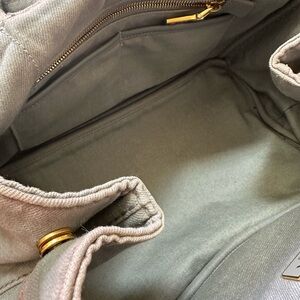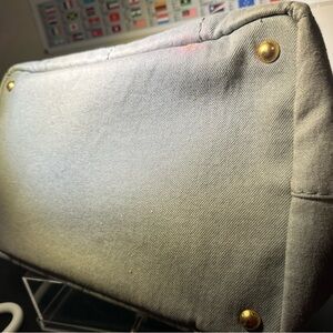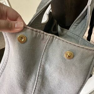 Elegant gray canvas tote with Prada logo. Sturdy handles. Perfect for everyday use.