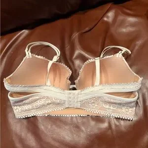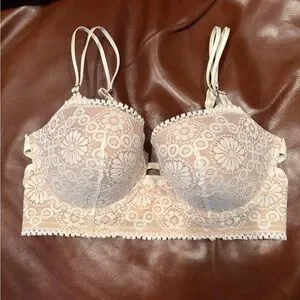 Chic lace bralette with intricate floral design. Soft cream and white hues. Adjustable straps for perfect fit. This bra has been worn once! I took the tags off and wore it for an hour before quickly realizing that it did not fit me correctly. Would love to find it a new home :)