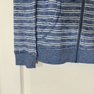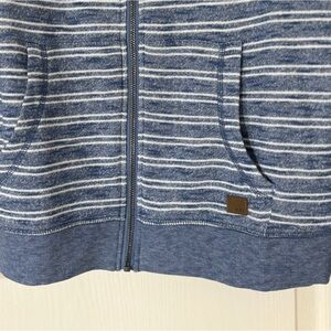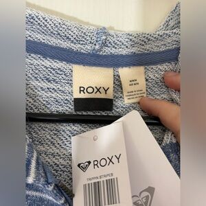 ROXY “Trippin Stripes” zip-up hoodie in blue/white heathered stripe. NWT. Size M. Soft, lightweight knit with kangaroo pockets, drawstring hood, and leather Roxy logo tab. Perfect for layering, beach days, or casual wear. Excellent condition — no flaws.