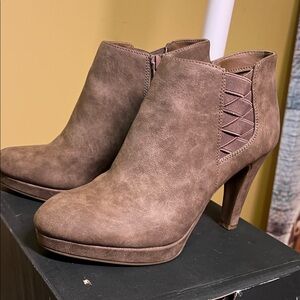 Stylish taupe ankle booties with side zipper. Elegant design with a comfortable heel.