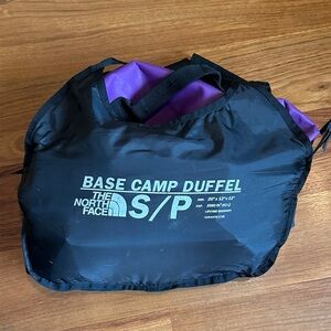 Bold purple duffel bag by The North Face. Features durable straps and spacious interior. In good clean condition, one discoloration spot and a few scratches on end logo.