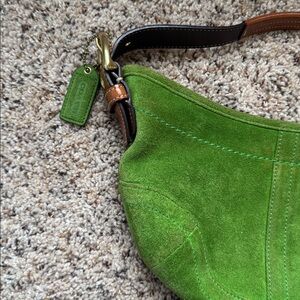 Small Vintage green suede Coach purse. Perfect for daily use. Review pictures for slight stain on purse. My first named brand purse. That I purchased at Coach 23 years ago.