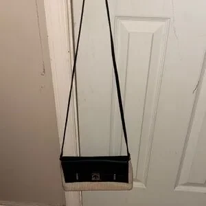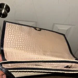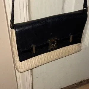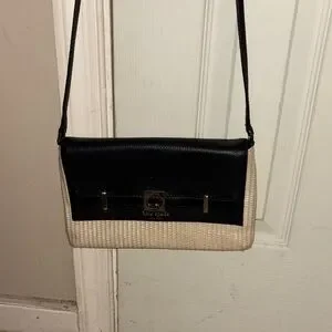 Elegant Kate Spade crossbody with a sleek black top and woven tan base. Ideal for everyday use.