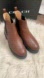 Stylish brown leather Chelsea boots with black elastic panels and chunky soles.