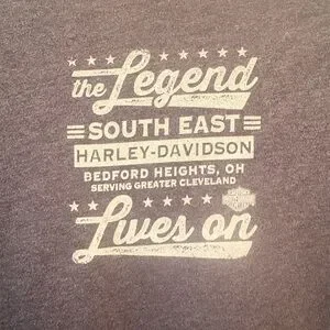 Gray tee with bold Harley-Davidson print. Features 'The Legend Lives On' text.