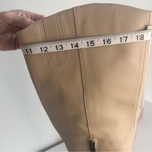 Tan Knee High Boots with 3 inch block heel. Only worn on one occasion. Wide Calf!! Very hard to find this style and color in wide calf. ~18 1/2 inches around largest part of calf, ~19 inches tall with ~3 inch heel. Pictured with light scuff mark on top left of shoe (as pictured)