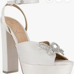 Elegant white platform heels featuring a sparkling rhinestone bow. Perfect for adding a touch of glamour to any outfit.