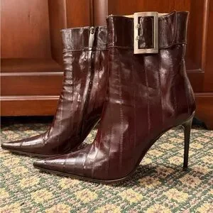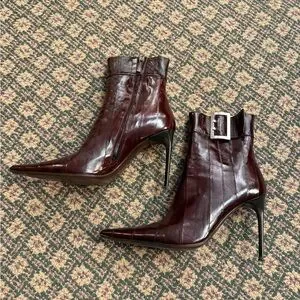Elegant burgundy boots with pointed toe. Features sleek buckle and high stiletto heel. Ideal for a sophisticated style.