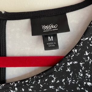 Mossimo black and white knit sheath dress. Elbow length sleeves with a ruffle. Round neck, zip at back neck. Mid weight, sort of scuba or ponte knit feeling fabric.