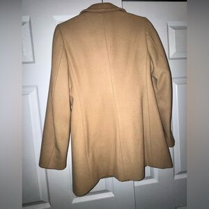 Timeless and elegant double-breasted coat in a warm camel/tan shade. Made from an 80% wool blend, this coat is warm, structured, and perfect for fall & winter. Fully lined with a soft, satin-feel interior. Features include: