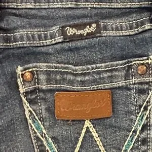 Stylish flare jeans by Wrangler. Deep blue hue. Comfortable fit. Adjustable waistband on inside