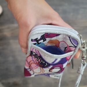 Chic Coach shoulder bags with matching wallets and keychain. Features pink, black, and purple, and dark blue accents. All items are in great condition.