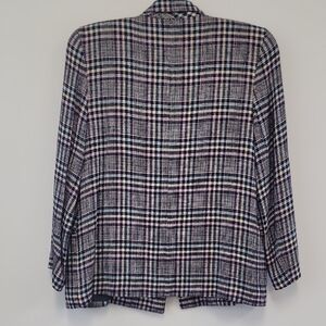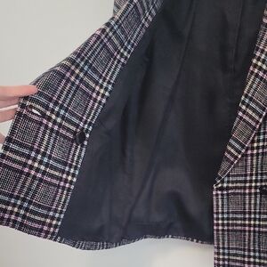 Chic plaid blazer with a double-breasted front. Black and white with pink accents. Ideal for any occasion.