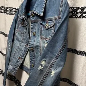 Stylish blue distressed crop denim jacket with unique western embroidery on the back. Perfect for any horse event! If this was a medium I would keep it.