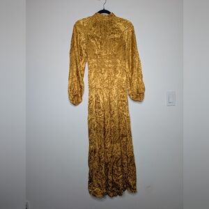 Stunning golden yellow jacquard maxi dress from Anthropologie. Features a beautifully textured floral/scroll pattern, a high mock neckline, soft pleated detailing, and full-length billowy sleeves with fabric-covered button cuffs. The smocked waist adds a comfortable, shapely fit, and the skirt flows into a long, elegant silhouette.