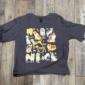 2) SHEIN, size S (oversized fit), gray, dog cartoon drawings, THIS HAS BEEN MODIFIED: bottom hem trimmed so it sits at the waist, t-shirt.