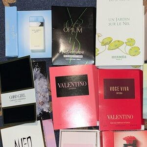 A collection of assorted designer perfumes featuring various brands and scents. Includes an extra plus a handful of sample gifts.