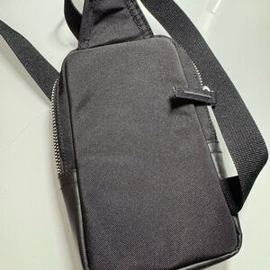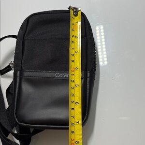 Modern and versatile Calvin Klein sling bag. Ideal for daily essentials or a night out. Compact but able to hold a phone wallet and keys. Single zipper and center pocket with a slot on the outside. Adjustable straps.