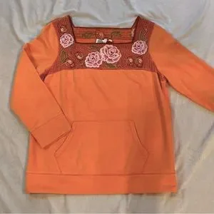 Vibrant orange top with pink floral embroidery. Square neckline. Long sleeves. Front pocket detail.