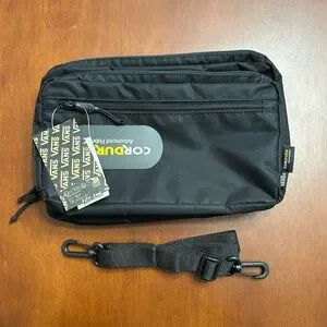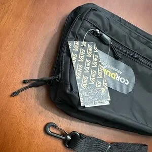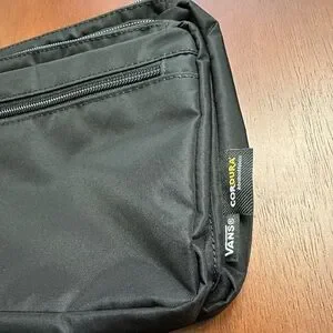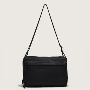 Compact Vans convertible crossbody bag in classic black. Features multiple zippered compartments and detachable/adjustable strap. Versatile bag which can be worn sideways or longways. Ideal for daily essentials.
