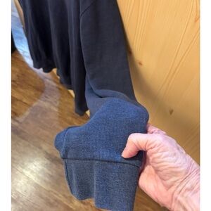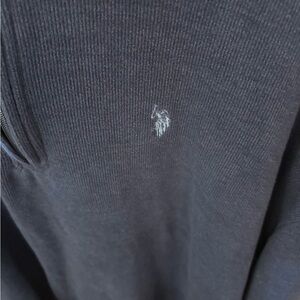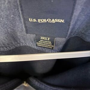 The U.S. Polo 3XLT Navy Pull Over Cotton Blend is a stylish and comfortable pullover shirt featuring a quarter zip and ribbed neckline, band around cuffs and bottom of pullover. Made from a blend of cotton, this shirt has a solid navy blue color with the signature Polo Pony logo accent. It has a relaxed fit and is machine washable, making it easy to care for and ideal for the fall and winter seasons. The oversized design and dark fabric wash add to the overall cozy feel of this shirt, perfect for men looking for a versatile piece to keep them warm and stylish. Good condition no holes, no stains, light fading due to wash and wear, no odors, no pets.