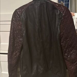 Sleek black leather jacket with burgundy quilted shoulders. Ideal for a modern look. Inside liner is torn, but overall good condition.
