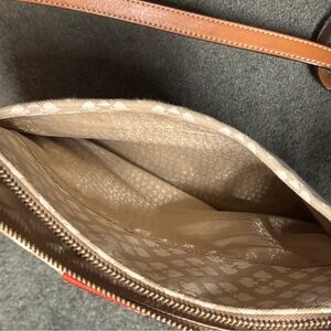 Chic Kate Spade crossbody with a beige pattern. Features bold pink and orange stripes. Perfect for everyday use. There is a pocket on the outside of the bag, as well as a zipper pocket on the inside. It has gold metal accents all throughout the bag and its hardware. The cross body strap is adjustable, much like a belt. FANTASTIC condition.