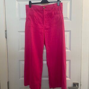 Cropped wide leg pants made of a stretchy material that feels like cotton (actually a linen, viscose, cotton and elastane blend). In a "medium pink" color that feels like a darker hot pink or raspberry color. High-waisted. Minimal wear. From a pet-friendly household.