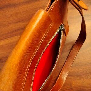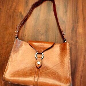 Handsome D&B saddle leather shoulder bag with heavy brass trim and four brass feet. One slip-in interior pocket and one zippered outside pocket. Red twill lining. All snaps and zippers working fine. Great, clean, preowned condition. Please see photos for size.