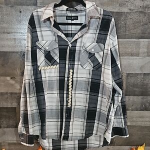 Upcyclcled Sz XL Plaid Button-Up Shirt with Graphic Patch