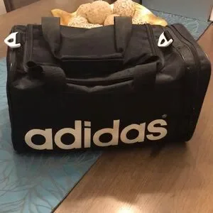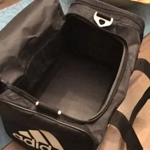Stylish and durable, this Vintage Adidas black duffel bag is perfect for gym sessions or weekend getaways. Featuring a spacious interior and sturdy handles, it combines functionality with a sleek design.