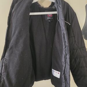 Cozy puffer with zip front. Includes side pockets and hood. Ideal for chilly days.