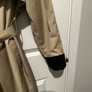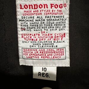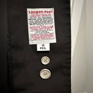 Vintage London Fog tan trench coat with black accents. Features a belted waist and button closure. 46 inches shoulder to hem. Size 10.