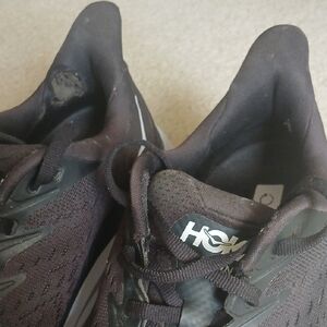 Sleek Hoka 'Clifton 8' shoes in black with white accents. Ideal for running and daily wear. See photos for details.