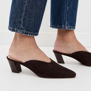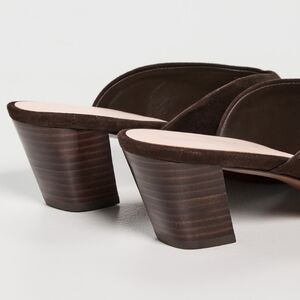 Mid-heel mule in brown suede. Features a kicked heel, pointed toe, and padded footbed with gold stamped logo. 2-inch heel.