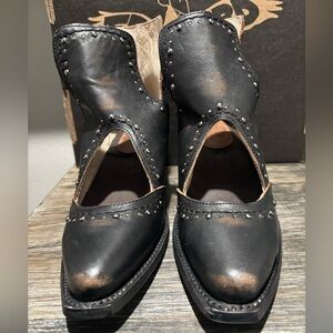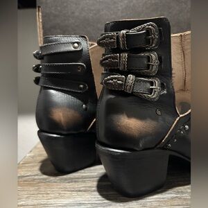 Turn up the volume with MELODY - the bootie that hits all the right notes. Crafted with 100% full-grain leather, this bold cutout design features studded trim detailing and three western-inspired metal buckles at the ankle. A slightly flared stacked heel adds just the right lift, while the deep V-cut sides and open instep bring a fierce, fashion-forward attitude.