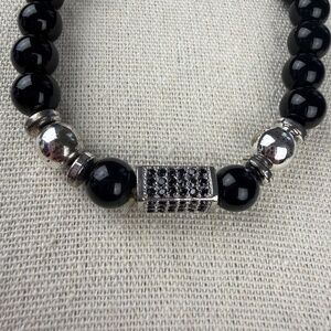 A sleek black beaded stretch bracelet featuring polished round beads paired with bold silver-tone accent pieces. The center pavé-style barrel detail adds a touch of sparkle and dimension, giving this piece a modern, elevated look. Comfortable and easy to wear, it’s perfect for stacking or adding a subtle statement to any outfit.