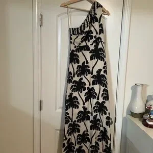 one-shoulder dress with bold palm print. Linen material with stretch around the bust
