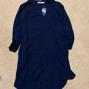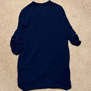 Modest three-quarter sleeves with roll-tab cuffs add a relaxed look to a simple dress that's perfect for casual office or daytime looks. Approx. 34" length (size S) Split neck Three-quarter sleeves with roll-tab cuffs Slips on over head Side slit pockets Curved high-low hem Unlined 97% polyester, 3% spandex Dry clean Imported
