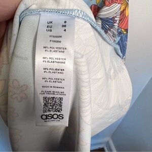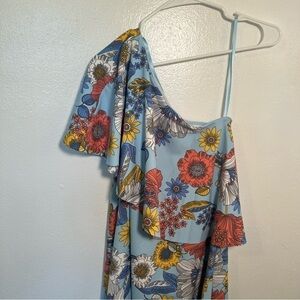 Great condition, new with tags. Asos Maternity. One shoulder cape dress. Hi low hem. Retro floral. Light blue with orange, yellow and white floral pattern. Size 4. Stretch 96% polyester, 4% elastane. Pit to pit laying flat 16” shoulder to hem 35”. All measurements are approximate and taken lying flat. Smoke free home. No trades, offers welcome.