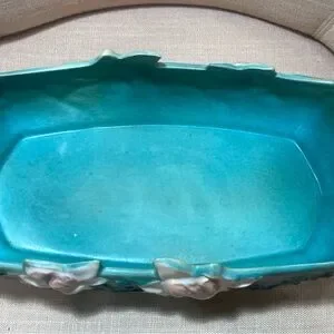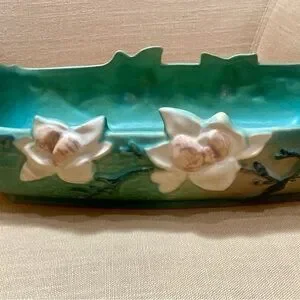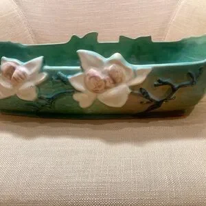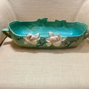 Elegant green ceramic planter with floral design. Perfect for home decor. This vintage Roseville Pottery console planter bowl is in very good vintage condition with no chips etc . This is extra large with double handles. The measurements are 18” length, 8.5” width. & 4 “ height. Measurements are approximate.