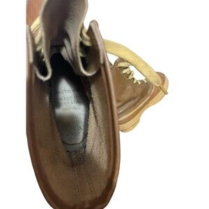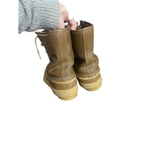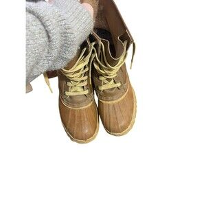 These vintage Sorel Youth Sz 6 Arctic Pac Kaufman Canada Brown Snow Duck Boots are a stylish and functional footwear option for teens. Made with leather and rubber, these lace-up boots feature a round toe and ankle shaft style, perfect for the winter, fall, or spring seasons. The brown color and duck theme add a playful touch to the solid pattern, while the wool lining and insole provide warmth and comfort. With a classic design and durable construction, these boots are a versatile choice for casual or activewear occasions.