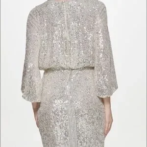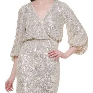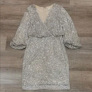 Elegant silver sequin mock wrap dress with three-quarter bubble hem style sleeves. Perfect for special occasions, holiday parties, New Year’s Eve, date night. Brand new condition, purchased and never worn. Hidden back zip, fully lined, stretchy, a sparkly stunner.