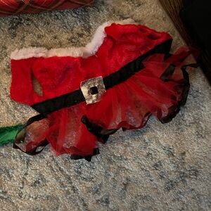 Pup, pup, and away! Set of festive pet outfits including a red onesie, plaid pajamas, green Christmas tree costume, and additional festive outfit. My little Eloise (aka. Ellie, Wheezie, Ellawheezie is too big for her Holiday britches. She is a big Shipoo now.) These are appropriate for an x-small or small pup.