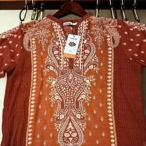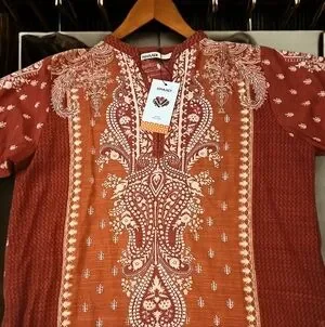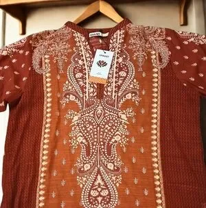 Designer wear beautiful rust red and white kurta made of lawn. Lawn is a lightweight fabric typically made from cotton, known for its smooth and silky texture, and is breathable and super soft.
