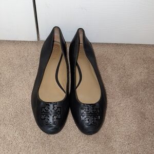 Chic black leather flats featuring signature Tory Burch logo. Sleek and versatile design. 8.5. Good condition, but have been previously loved. I ran out of black shoe polish, but the leather has been cleaned & conditioned. Would probably look amazing with black polish/cream